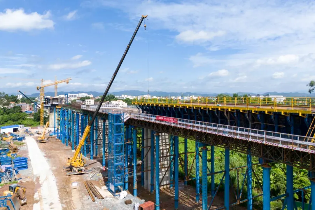 “目前,全线的桩基累计完成95%,承台累计完成242座,墩台身累计完成223座,箱梁预制日均1.5榀,累计完成153榀,小型预制构件厂和轨枕厂也即将正式投产,其中,全线7联连续梁和连续刚构施工均有较大突破,瑞平特大桥、跨肇阳高速公路特大桥项目,施工人员正在不舍昼夜地抢抓铺设架梁通道。接下来,项目将转入桥梁上部结构及路基填筑的施工阶段。”中铁二十二局集团有限公司深南高铁SNSG-1标项目经理部副经理蒋太亮介绍。