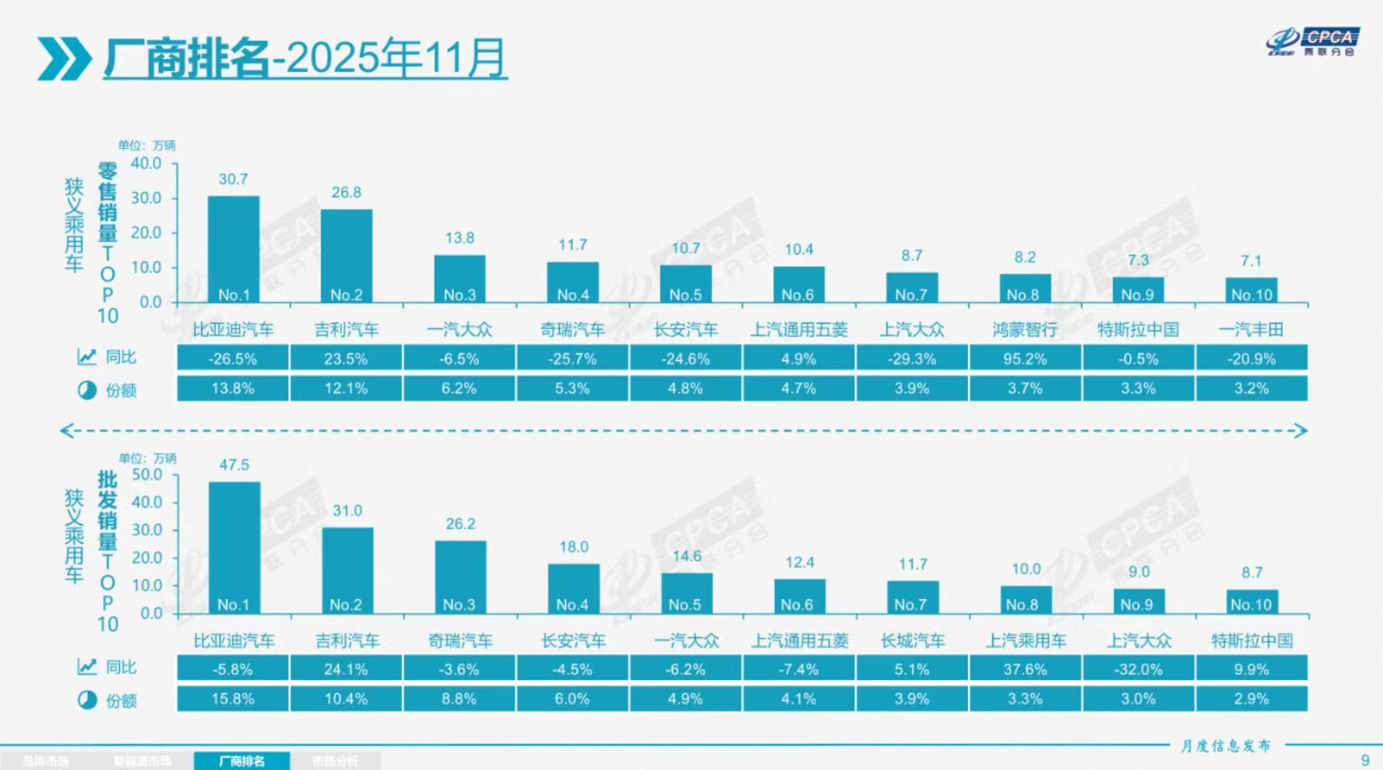 具体到车企,11月,比亚迪汽车以30.7万辆的零售销量居榜首位置,但同比下滑26.5%,市场份额为13.8%。吉利汽车以26.8万辆的零售销量排第二,同比增长23.5%,市场份额为12.1%。一汽大众排第三,销量13.8万辆,同比下滑6.5%;奇瑞和长安汽车列第4、5位,分别同比下滑25.7%、24、6%。