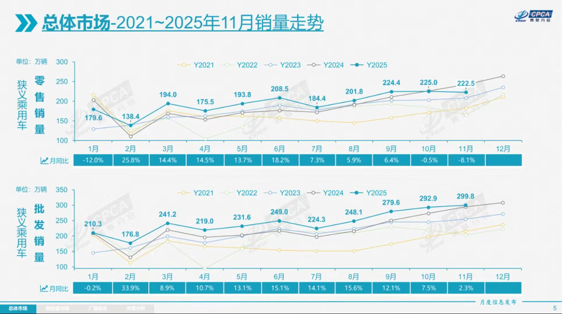 乘联分会表示,由于今年的前期增长较快,政策补贴本身目标是稳定总体增长幅度,因此年末稳增速的现象是合理的走势。去年11月的超高基数,今年11月的小幅负增长是熨平了去年的高增长,相对2022年11月增速仍达5%,因此总体走势仍是相对正常的。